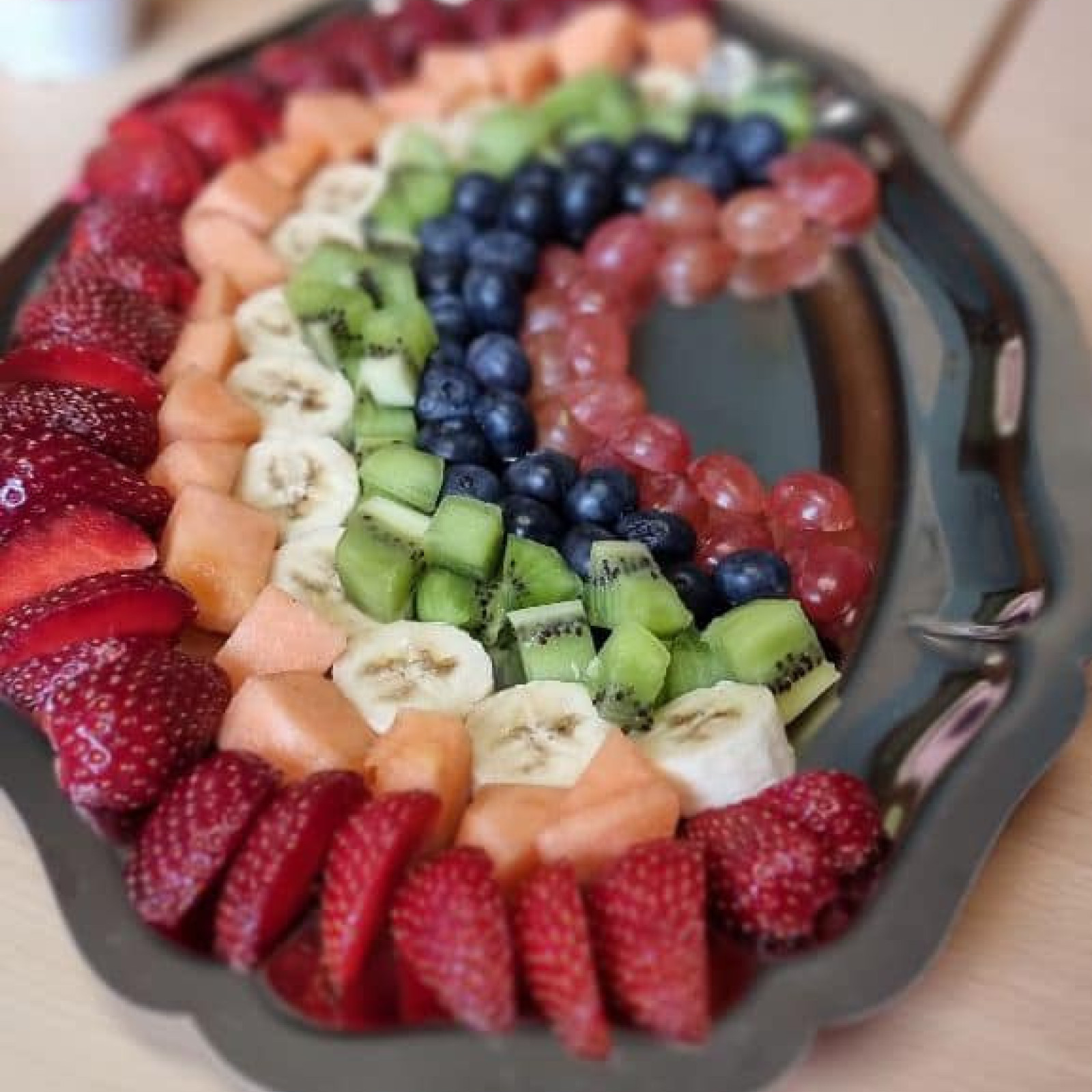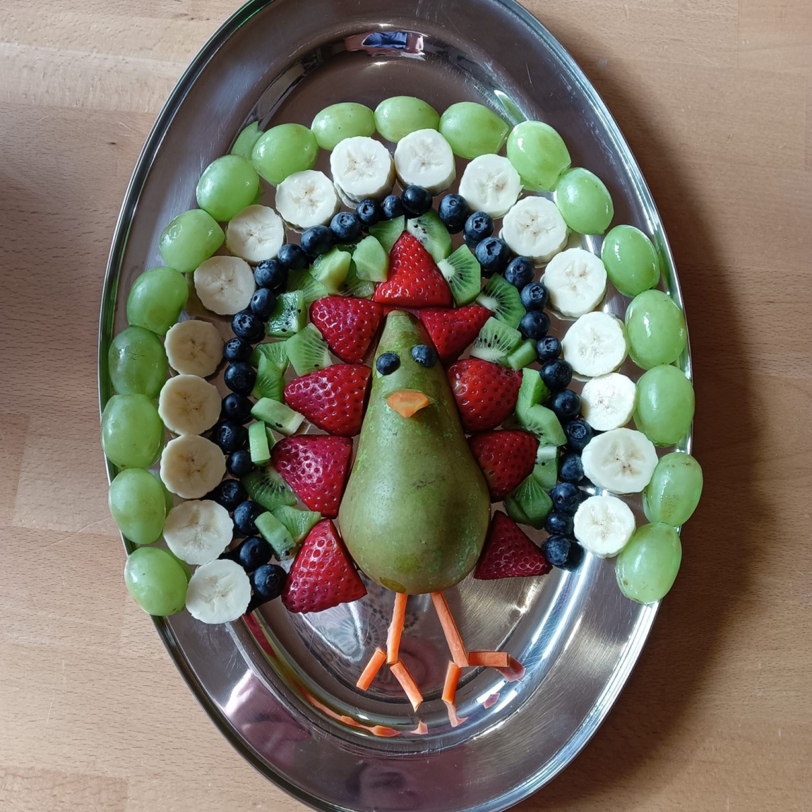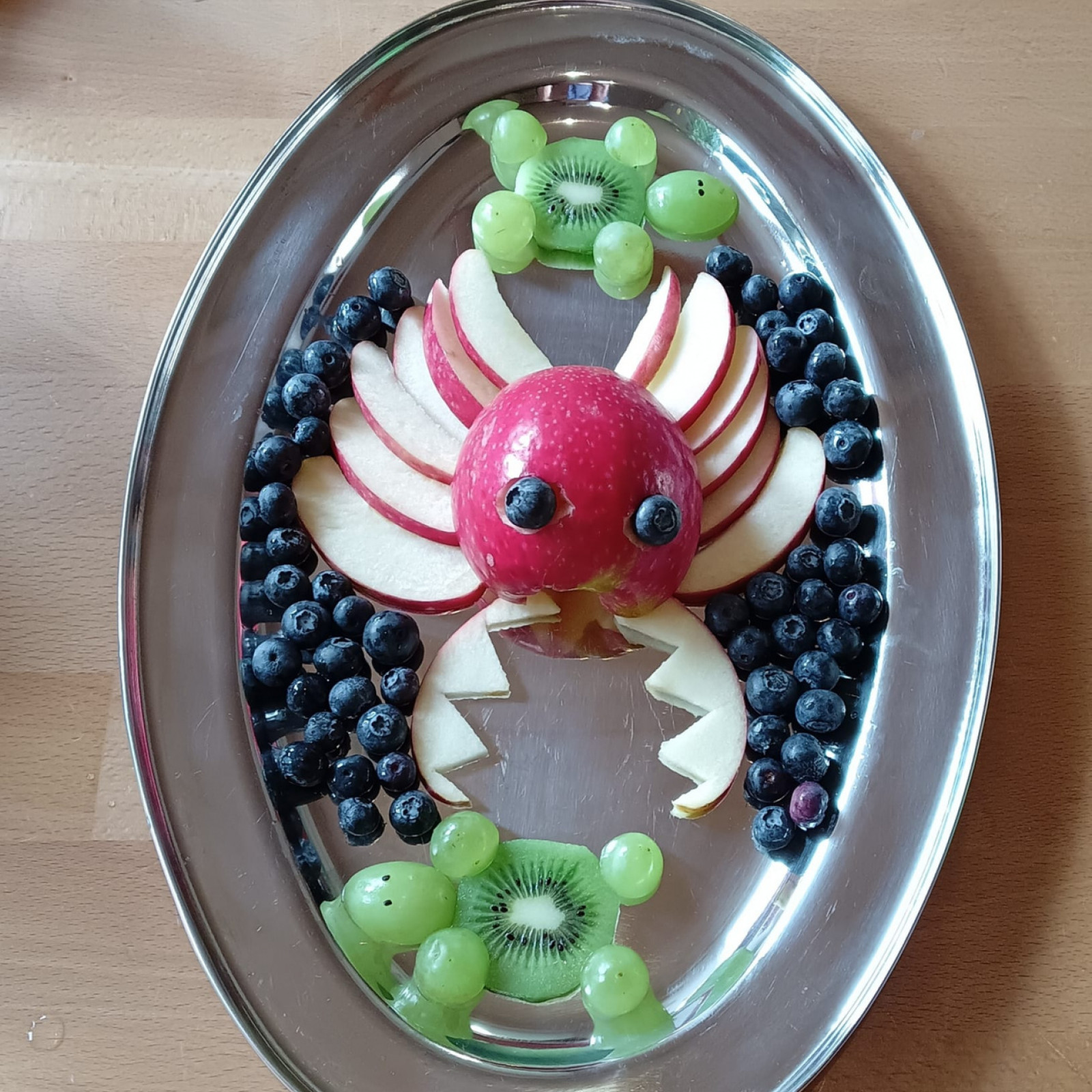 Und sogar bei unserem Mittwochsfrühstück gab es in der letzten Woche Obsttiere. Da staunten die Kinder nicht schlecht. Und das leckere Obst schmeckt doch glatt noch besser, wenn es so hübsch dargestellt ist. In Windeseile wurden Pfau, Krabbe und Schildkröten restlos von den Kleinen verputzt.
