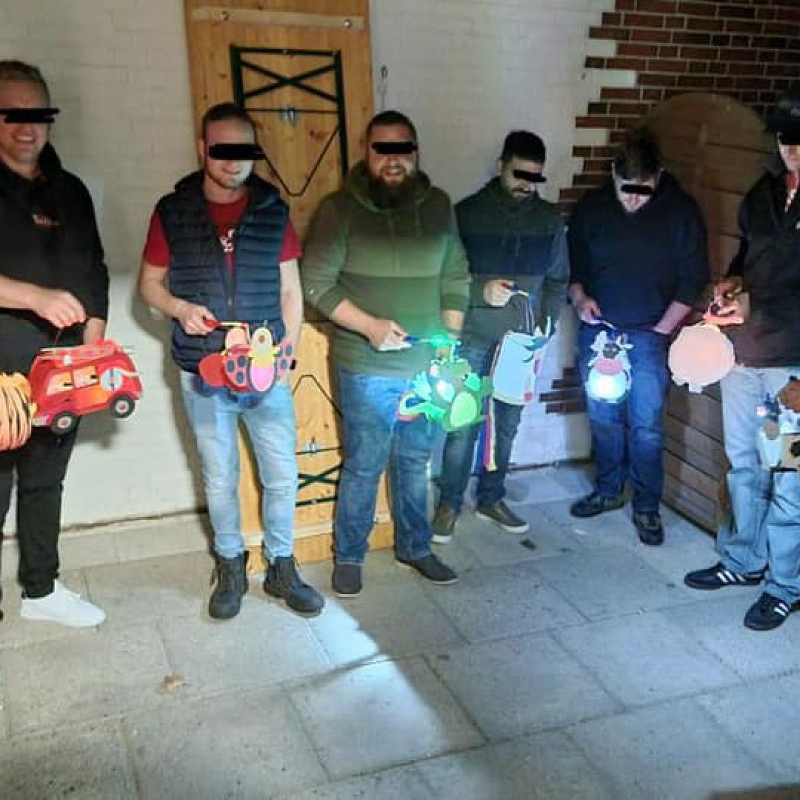 Das ganze Wichtelhaus wurde also auch herbstlich dekoriert und schließlich haben wir uns dann auf Martini vorbereitet. In diesem Jahr haben wir uns dazu mal was Neues ausgedacht: Es fand ein Elternabend mit den Vätern statt. In lockerer Atmosphäre, mit einer Bratwurst vom Grill, lag das Laternenglück der Kinder in diesem Jahr in den Händen ihrer Väter. Denn es war ihr Auftrag , die zuvor ausgesuchte Laterne für ihre Kinder zu basteln. Nach einigen Stunden waren alle Laternen fertig, alle hatten gute Laune und die Ergebnisse können sich wirklich sehen lassen. Ein schöner Schnappschuss entstand schließlich, als sich alle Väter im Halbkreis mit den leuchtenden Laternen ihrer Kinder aufstellten. Jetzt gerade werden fleißig Laternenlieder geübt.